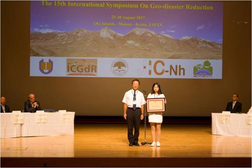 会议期间,国际地质灾害与减灾联合会(ICGdR)聘任洪勇老师成为ICGdR2017-2019年度主席助理,并为其颁发了终身会员证书。周蓉在青年论坛这一专题中作了题目为“Fast shear behavior of saturated and dry loess at South Plateau of Jingyang, shanxi”的报告,并获得了“Promising Young Scientists Award”。