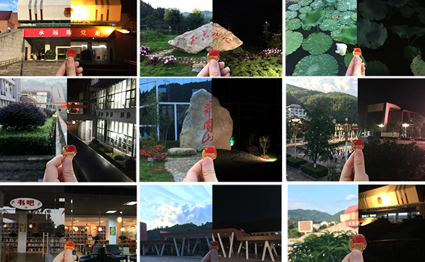 团队成员在基地各个角落寻找动人风景,分别在白天与夜晚在同一角落与团徽合影,并利用软件后期将照片合成为一张,在同一张照片中展现日光与夜色下团徽与基地的默契。九处风景、九张合影、九次感悟表达了团队对井冈山革命根据地90周年的衷心祝贺和崇高敬意。“和我在井冈山路上走一走,直到所有的星星都亮了也不停留。”巧妙的改编歌词给作品增添了文艺气息,充分展示了基地与团队成员朝气蓬勃、青春向上的良好精神风貌。