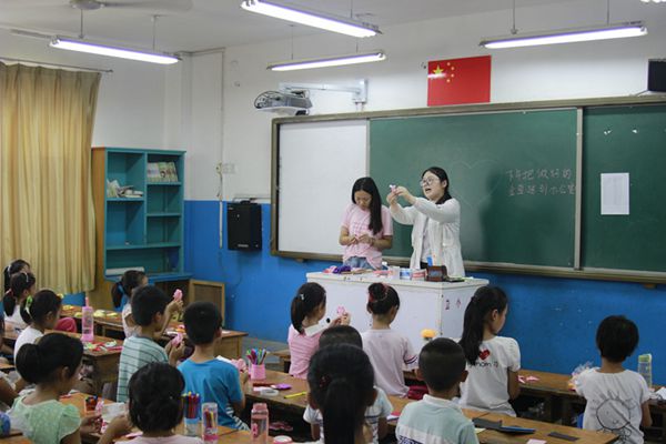 益海小学支教活动是针对小学生们日常的学习计划开设的第二课堂。团队成员充分发挥专业优势和自身特长,根据孩子们的年龄阶段,为其开设了丰富的课程,有创意设计、手工制作、绘画、音乐、舞蹈、体育等课程。如拓印课让孩子们更具象的认识了世界,更细致的观察到这个世界存在的丰富纹理,建立了孩子们的美学观。创意手工课提高了孩子们的动手能力,培养了孩子的创新意识。丰富的课程拓展了孩子们的课外知识,培养了孩子对艺术的兴趣,促进了其身心健康全面发展。最后,团队还精心准备了支教成果展览和一场文艺汇演来和孩子们告别。益海小学五个年级共计150名学生参加了此次演出。
