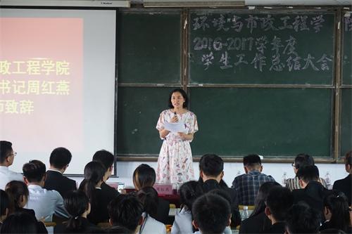 为全面总结2016-2017学年学生工作,环境学院于7月7日下午在一教300阶召开了学生工作总结大会。环境学院党总支副书记周红燕,团总支书记张恬,辅导员胡现龙、岳磊、花会娟参加了会议。