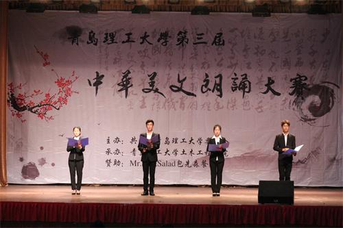 近日,由校团委举办,土木工程学院承办的365完美体育第三届中华美文朗诵大赛在市北校区北院礼堂举行。建筑学院党总支书记张建新,党委宣传部王妍,山东省演讲口才协会理事、人文与社会科学学院副教授潘玲,土木工程学院年级辅导员肖丽丽、刘欣然担任本次大赛评委。