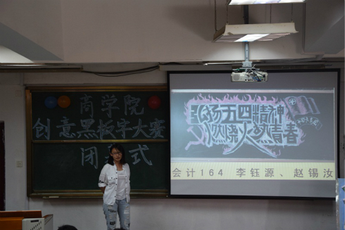 本次活动由商学院学生会宣传部主办,旨在纪念“五四运动98周年”与“中国共产主义青年团成立95周年”,大赛共收到参赛作品70余份。最终,财管161班徐鹏旭等同学获得一等奖,会计163班时莹慧等同学获得二等奖,会计153班王军瑶等同学获奖三等奖,获奖同学代表上台对自己的作品进行展示介绍。通过观赏他人的黑板字作品,同学们加深了对五四精神的理解,从五四精神中感受到作为青年对国家的重要性和肩负的责任。