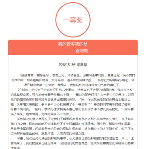 怀着对革命先辈的感激与对将来为祖国贡献力量的期待,区规151班的梁嘉慧同学以其娓娓道来的中国梦故事——《路与鞋》荣获本次“我的青春我的梦”征文大赛的一等奖。文章由军训缅怀先烈长征,从爷爷的故事感慨老一辈“中国梦”的来之不易,自扶贫调研体会大学生需要承担起的责任和应该付出的努力,把中国梦的实现之路比作新时代的“长征路”;把努力学习、认真工作、走到社会中去的实际行动比作无形的“草履军鞋”,巧妙表达出当今时代更应该学习继承并延续长征精神去实现中国梦的主题思想。此外,园林151吕方舟、建学144况赫等同学获得二等奖;建学152张雪萌、建学152王琪、建学151罗紫娟等同学获得三等奖。
