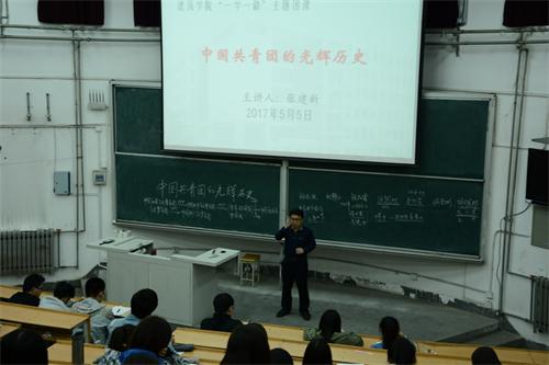 为深入学习贯彻习近平总书记系列重要讲话精神,积极落实“一学一做”教育活动,加强青年学生对团组织的认识,充分发挥组织的“后备军”作用,以奋发学习、努力工作的实际行动迎接党的十九大胜利召开,建筑学院于5月5日下午在建筑馆111举办了“一学一做”主题团课——《中国共青团的光辉历史》。本节主题团课的主讲人为建筑学院党总支部书记张建新,建筑学院团总支、学生会主要干部以及2013-2016级部分学生参加了本次活动。