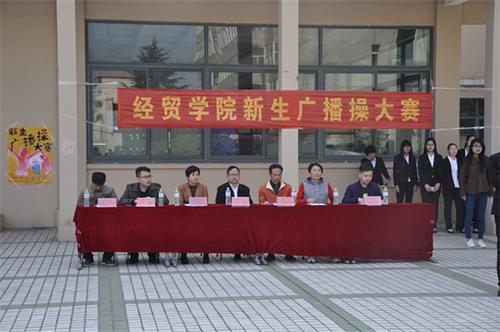 4月12日下午,经贸学院在二食堂二楼举办新生广播操大赛。校体育教学部王爱玲、刘振良、董凤翠以及经贸学院党总支副书记王粲、团总支书记王振、16级辅导员姜圣天及经贸学院学生会主席任恒志担任本次大赛的评委。