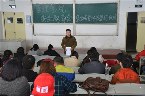 3月30日下午,管理学院于二教阶401举行安全教育会暨公寓安全责任书签订仪式。管理学院党总支副书记申维东,管理学院各年级辅导员及各班治保组长参加了此次会议。本次会议由辅导员陈永亮主持。