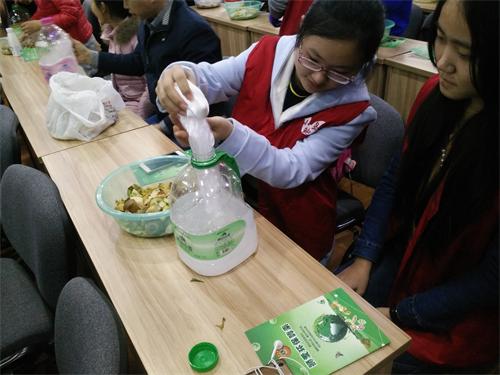 志愿者们提前赶到现场,协助社区进行会场布置并安排上清路小学的同学们就坐。制作过程中,志愿者一边帮助小朋友制作,一边向他们讲解酵素小知识。志愿者还积极地向社区人员请教关于酵素的制作及使用等问题,获益匪浅。