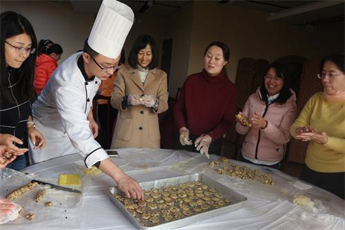 曲葭老师给大家纷发食材,现场进行巧克力曲奇制作课程的教学,在两个小时的教学活动里,土木学院40余名女教职工认真听讲,积极动手。在曲葭老师指点下,女教工们很快便掌握了制作技巧,烘焙出色香味俱全的点心。