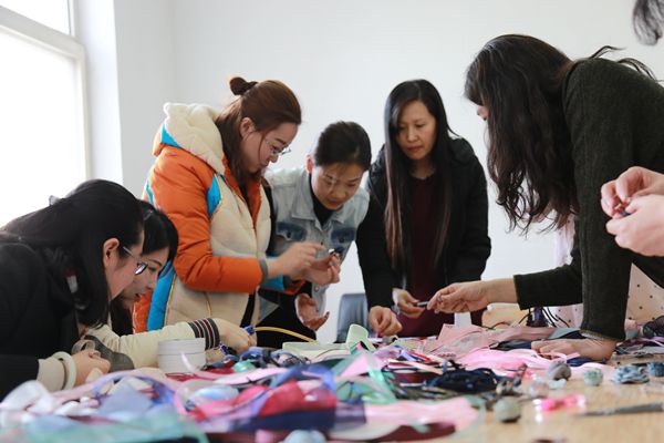 活动专门邀请了学院张亚先老师为大家传授制作技巧。首先张老师先简单介绍了面料材质、工具使用的技法,然后分步骤教授女教师们制作手工发饰。制作过程中,女教师们边看边学,认真领会,有的还不时向张老师请教,或者同旁边的人交流。经过一个多小时的亲自动手体验,一个个独具特色的手工发饰展现在大家眼前。活动现场,女教职工们热情高涨,欢声笑语不断,老师认真传授,学员虚心学习,很快各式各样的手工头饰诞生了。